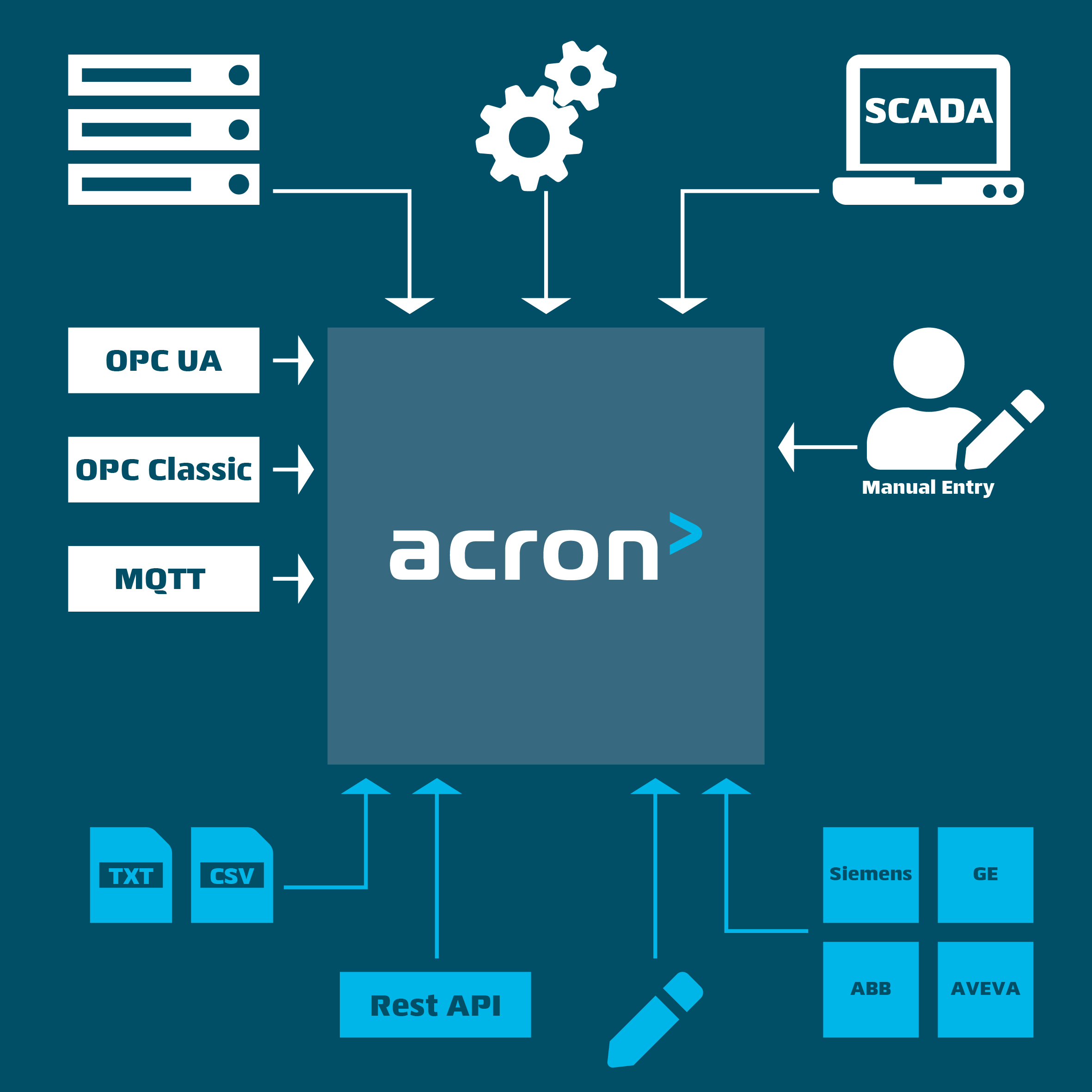 With more than 40 supported interfaces, acron is able to read data from almost any equipment or SCADA system. This covers nearly all popular methods used by modern devices to communicate, including: