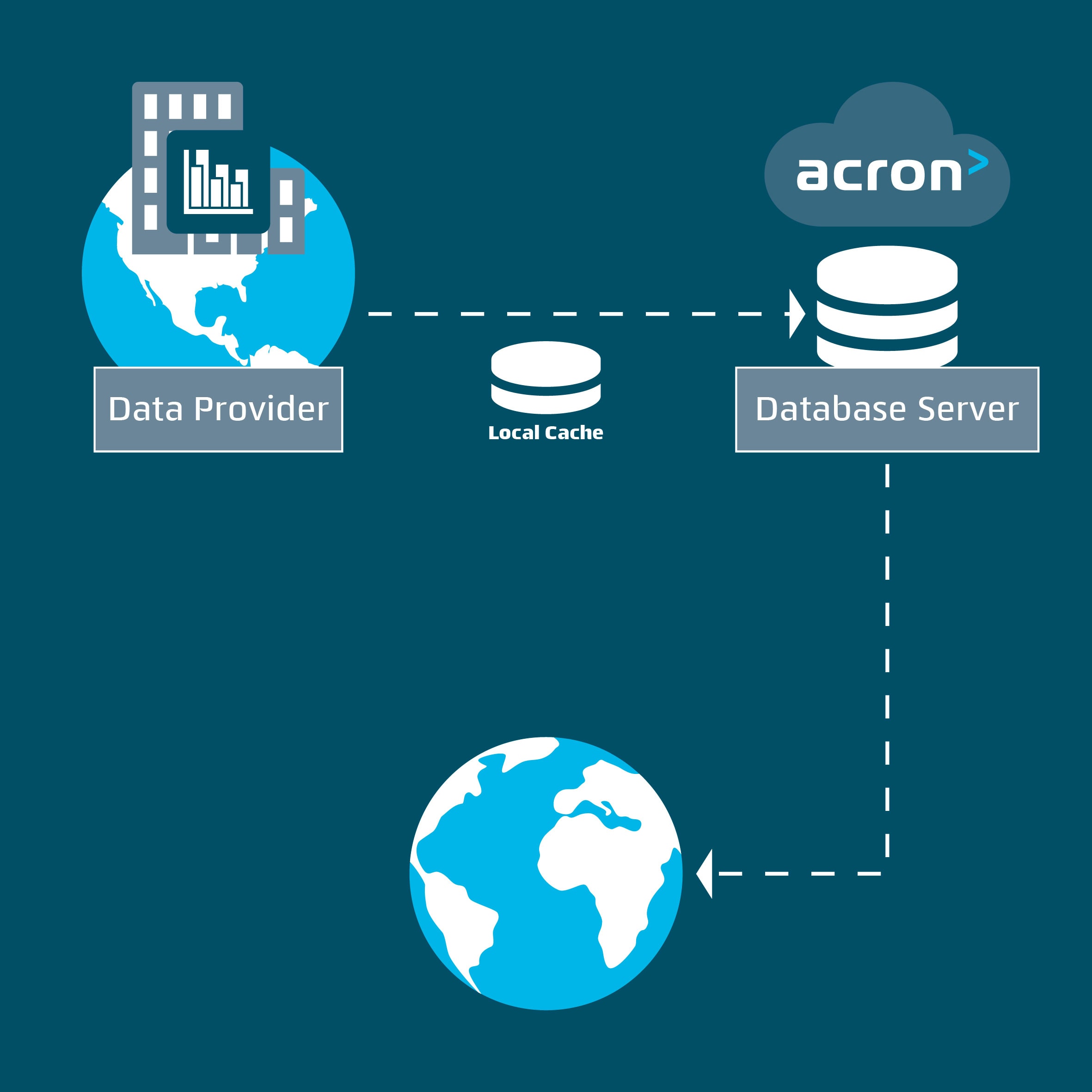 In case of a connection problem, the data is saved to the local cache of the provider, and held for transfer to the acron database server until the connection is restored.