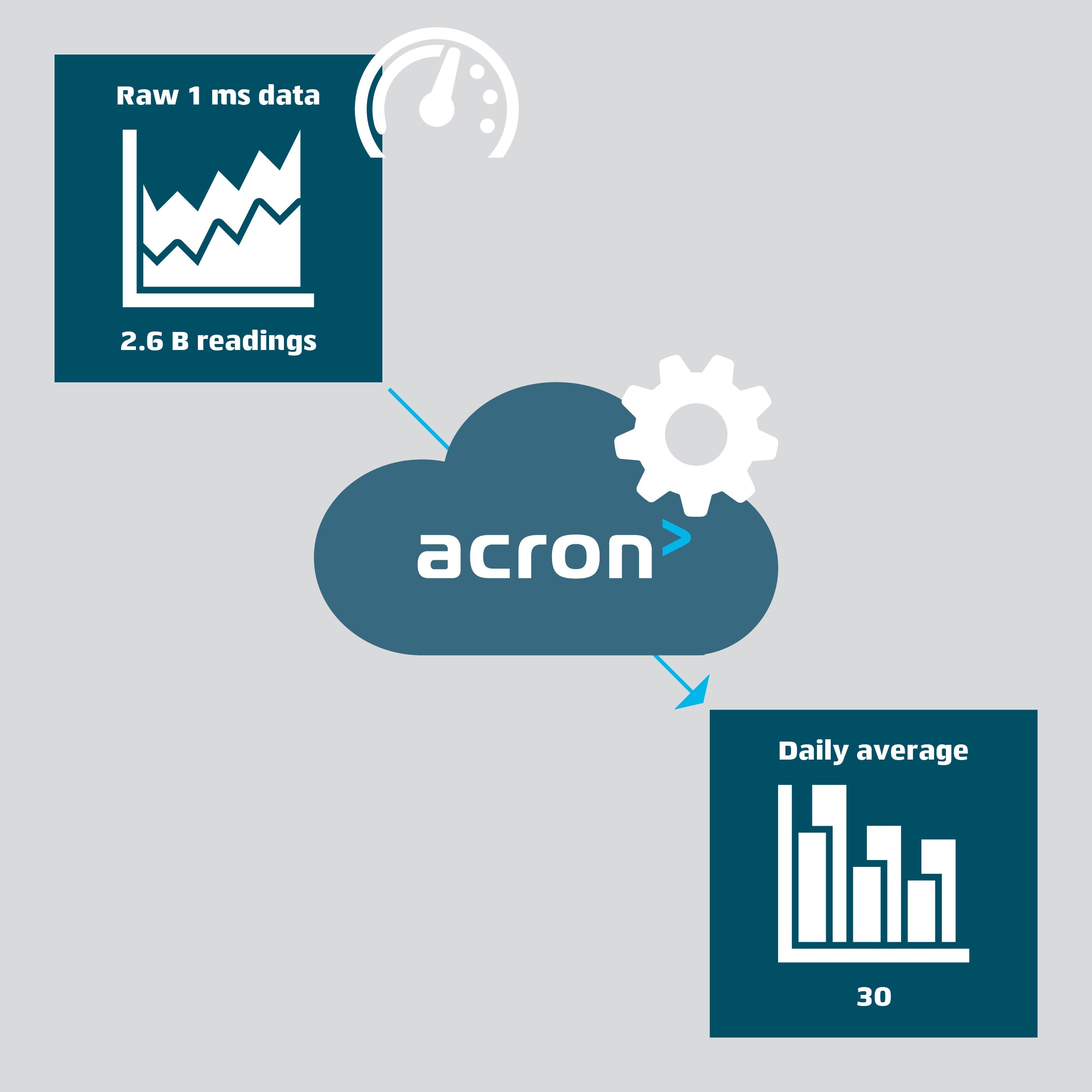 acron can save a measured value per millisecond. This commulates to about 2.6 billion measurements per month – a lot of raw data. But when analyzing the performance of a month, not all those measurements are needed. The average daily value may be sufficient, the average being only 30 values – which takes your computer a lot less time to process than 2.6 billion.
