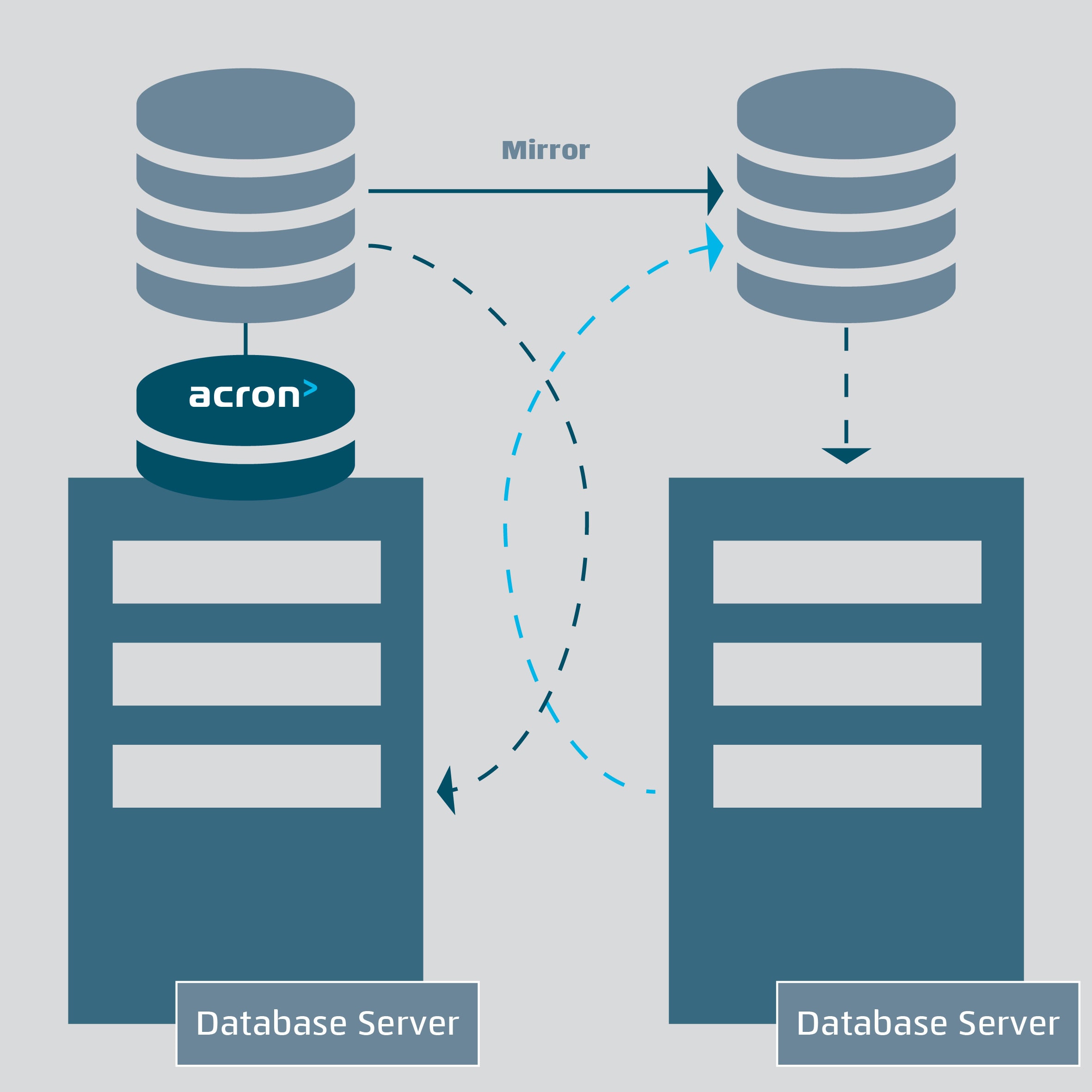 The acron mirror module allows acron data from one server to be kept identical to the data on another. If one database server fails, all operations can immediately be continued on the second, mirrored server. As soon as the failed server is restored to operation, it updates its data from the mirror server.