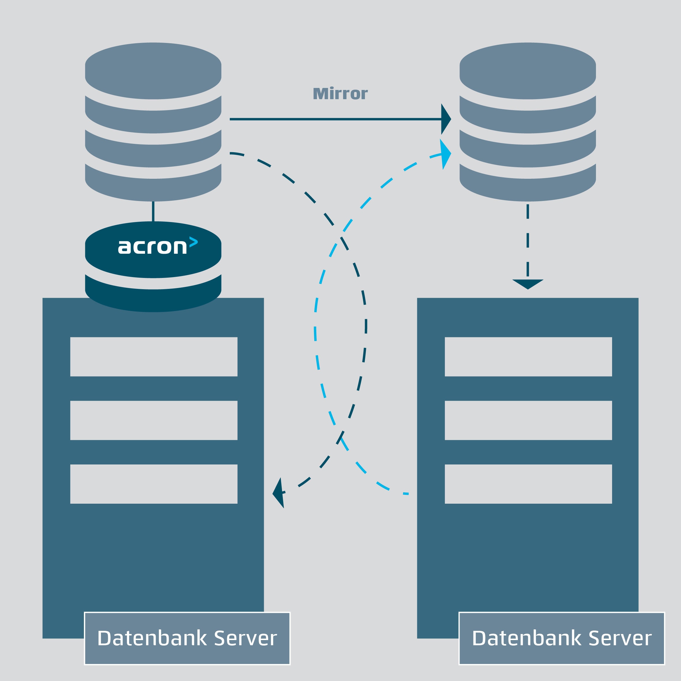 Auf diese Weise lassen sich sowohl eine Backup-Lösung als auch eine vollständige ausfallsichere Redundanz realisieren. Betreiber, die Daten aus acron verwenden, bemerken möglicherweise gar nicht, dass ein Ausfall aufgetreten ist.