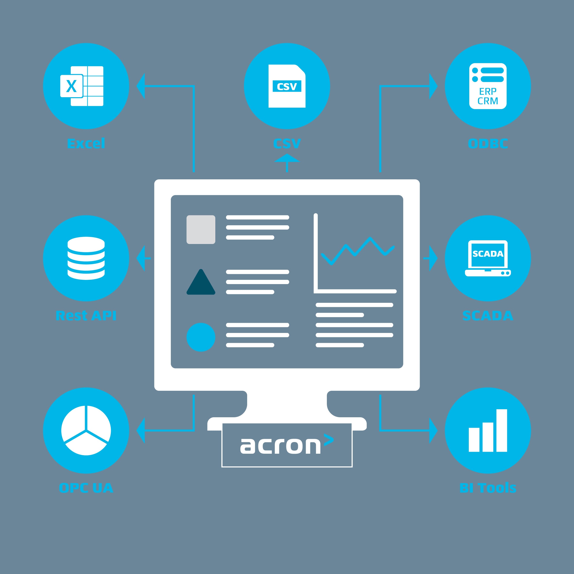 Anschließend stellt Ihnen acron diverse Schnittstellen zur Verfügung, über die Sie Ihre Daten in verschiedenen Formaten analysieren und exportieren oder Ihren Workflow automatisieren können (z.B. um auf mögliche Warnungen zu reagieren).